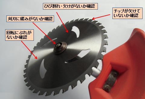特に刈刃に緩みがあると外れて飛んでしまう場合があり危険です。刈刃は正しく取り付け、締め付けられているか確認してください。刈刃のチップが欠けたまま使用した場合、欠けてチップが目に飛び込むなど、思わぬケガをする場合があります。また、特に刈刃のひび割れや異常がある場合には必ず新品と交換して下さい。